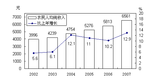 圖7 2003-2007年城鎮居民人均可支配收入及其增長速度