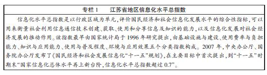“十一五”期間,是江蘇信息化進程中的重要5年。全省上下緊緊圍繞富民強省、“兩個率先”的戰略目標,全面貫徹落實科學發展觀,認真實施《省政府關于進一步加快國民經濟和社會信息化的意見》(蘇政發〔2005〕26號),順利完成了“十一五”信息化總體目標和主要任務,信息化進入了全面發展的新階段,對經濟社會發展的基礎性推動作用日益顯現。2010年,全省信息化水平總指數超過了0.73,提前2年實現了國家提出的“十一五”期末信息化水平總指數超過0.7的目標。