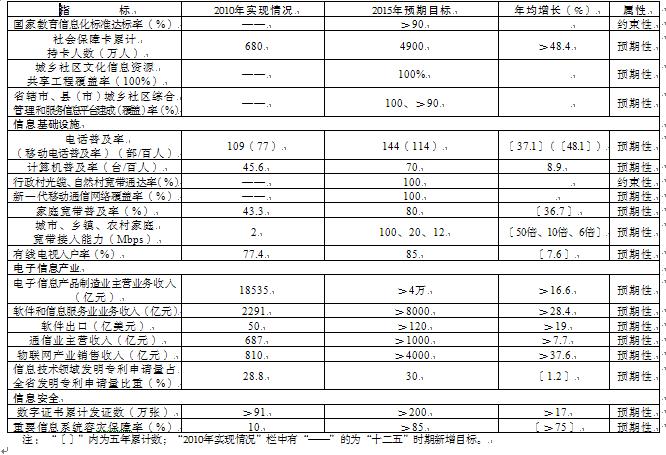 全省信息基礎設施達到國家一類地區水平,寬帶、融合、安全、泛在的信息基礎網絡基本建成。在全國率先實現新一代移動通信網絡全覆蓋,沿江無線寬帶城市群建成,市、縣城區中的熱點地區實現無線寬帶全覆蓋;農村地區建成先進適用信息網絡,行政村和自然村光纖通達率均達到100%。寬帶用戶達到2000萬戶,家庭寬帶普及率達到80%;城市、鄉鎮、農村家庭寬帶接入能力分別達到100M、20M、12M比特每秒(Mb/s);計算機普及率達到70臺/百人,電話普及率達到144部/百人(其中,移動電話普及率達到114部/百人)。縣級以上城市有線廣播電視網絡數字化、雙向化改造完成,有線電視入戶率達到85%,基本覆蓋全省的地面數字電視網和移動多媒體廣播電視網建成。三網融合試點工作取得階段性成果。“智慧城市”建設探索初見成效。