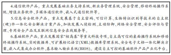 大力發展軟件產品,加快推動計算機輔助設計和輔助制造(CAD&CAM)、產品數據管理(PDM)、產品生命周期管理(PLM)、制造執行管理系統(MES)、過程控制系統(PCS)、數字控制系統、企業資源管理(ERP)、供應鏈管理(SCM)等關鍵工業軟件的研發應用,著力推進行業應用軟件、嵌入式軟件、游戲、動漫等優勢軟件發展,加快發展信息安全軟件、高端信息技術服務工具和平臺軟件、新興網絡應用軟件,支持物聯網服務器端應用軟件、中間件、數據挖掘和分析軟件、傳輸層和終端嵌入式軟件等研發與應用。以三網融合、物聯網、通信網絡升級換代等為契機,推動基礎軟件、工業軟件、行業應用軟件和移動互聯軟件的研發和產業化。開展行業應用軟件示范推廣,強化軟件研發與應用互動,支持發展具有自主知識產權的軟件產品。