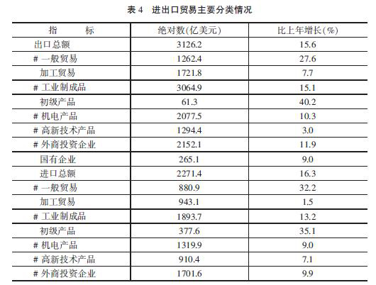 進出口規模繼續擴大。千方百計穩定外貿發展,在境內外舉辦一系列經貿活動,積極拓展市場。全年進出口總額5397.6億美元,比上年增長15.9%。其中,出口3126.2億美元,增長15.6%;進口2271.4億美元,增長16.3%。