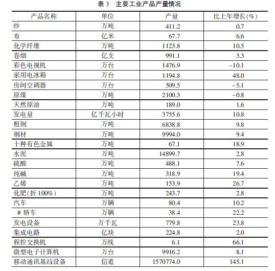 工業生產穩定增長。全年規模以上工業增加值比上年增長13.8%,其中輕、重工業增加值分別增長11.1%和14.8%。國有工業增加值增長10.3%,集體工業增加值增長5.3%,股份制工業增加值增長13.9%,外商港澳臺投資工業增加值增長13.8%。在規模以上工業中,國有控股工業增加值增長9.5%,私營工業增加值增長16.7%。