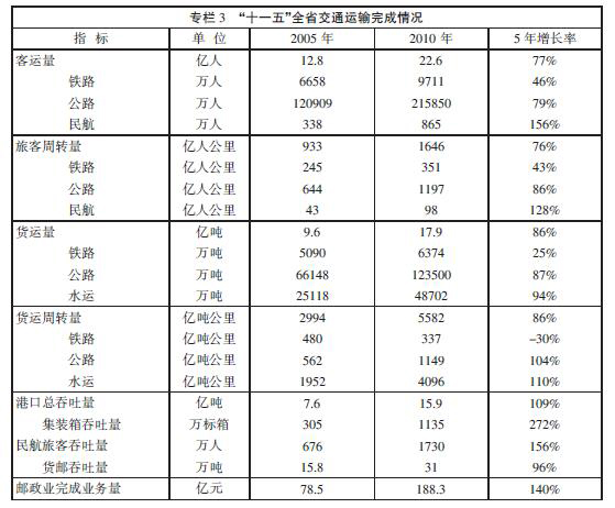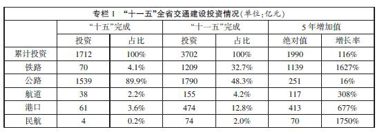“十一五”是我省交通史上投資規模最大、發展速度最快的時期,在基礎設施總量規模、運輸能力供給和服務質量提升等方面取得了顯著成就,為經濟社會平穩較快發展提供了重要的支撐和保障。交通運輸業進入各種方式協調發展、能力擴大與效率提高并重、全面建設現代綜合交通運輸體系的新階段。