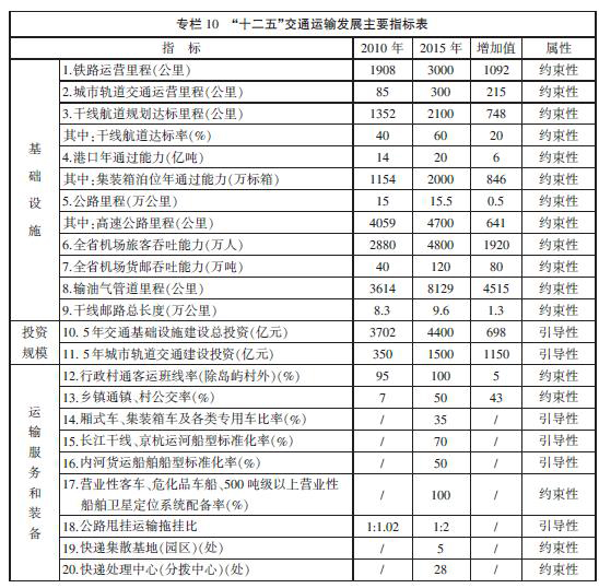 鐵路。積極推進鐵路建設,重點建設江北鐵路網、鐵路過江通道和全線貫通我省南北的沿海鐵路大通道。以繁忙干線客貨分線為目標,全面提升京滬、隴海兩大國家級鐵路通道運輸能力。以服務長江三角洲一體化為目標,構筑完善鐵路干線網。以保障大宗物資運輸、推動沿海港口發展為目標,積極構筑全省鐵路貨運系統。到2015年,新增鐵路運營里程約1000公里,總里程達3000公里左右,預期投資1200億元左右,力爭建成“三縱三橫”鐵路干線主骨架,構建到上海、杭州、合肥等周邊重點城市的快速通道,路網運輸周轉能力比“十一五”時期末提升30%。