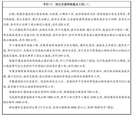 綜合交通網絡布局進一步完善。力爭建成“三縱三橫”鐵路干線主骨架,營業里程由“十一五”時期末的1908公里增加到3000公里左右,時速200公里以上的電氣化鐵路基本通達省轄市,實現長江三角洲核心城市1小時通達、省會城市與省轄市2小時通達。城市軌道交通運營里程由85公里增加到300公里左右,南京城市軌道交通初步成網,蘇州、無錫城市軌道交通主骨架初步形成。建成“兩縱三橫一網”干線航道網絡,干線航道達標里程由1352公里增加到2100公里,達標率由40%提升到60%,三級以上航道通達全部省轄市。公路網總里程由15萬公里增加到15.5萬公里,“五縱九橫五聯”高速公路網絡基本形成,高速公路里程由4059公里增加到4700公里,實現縣縣通高速,普通國省干線公路基本覆蓋重點中心鎮、省級以上經濟開發區和主要交通節點,農村公路通達度、建設標準進一步提升。輸油氣主干管道總里程由3614公里增加到8129公里。干線郵路總長度由8.3萬公里增加到9.6萬公里。