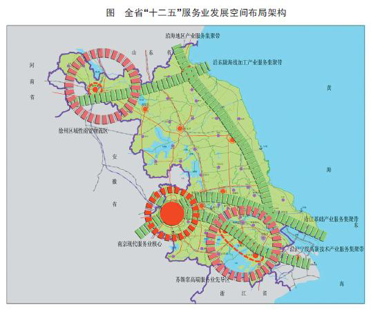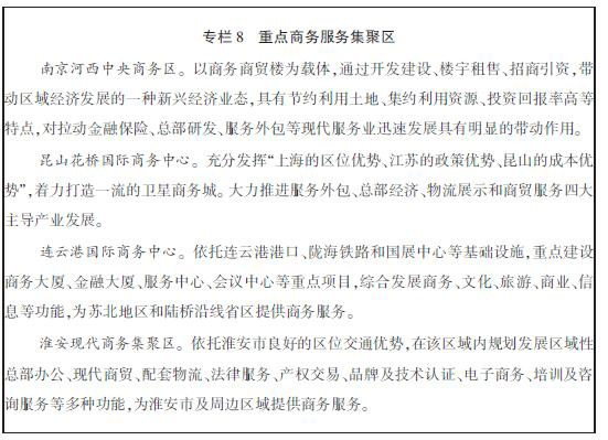商務服務集聚區。以金融、商貿、商務活動為主體,集中布局總部、地區總部,發展高級商務酒店、高級生活服務相配套的商務服務業聚集區。以南京為中心,建設輻射南京都市圈的區域性商務集聚區,強化南京河西CBD建設。以昆山、蘇州為中心,建設輻射無錫、南通以及上海縣(區)的特色商務服務集聚區,為制造業的快速發展提供專業化服務。以徐州為中心,建設輻射徐州都市圈的商務服務集聚區,為徐州老工業基地改造提升提供重要金融商務支撐。在連云港、鹽城、南通等地建設沿海地區商務集聚區,為沿海開發提供服務。