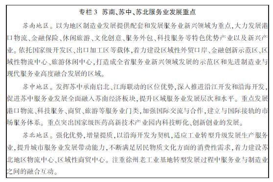 蘇錫常高端服務業先導區。依托先進的制造業基礎,通過產業融合及承接國際服務業轉移,重點發展港口物流、金融保險、休閑旅游、文化創意、服務外包、科技服務、商務服務等特色優勢產業以及新興服務業,打造成全省服務業新興領域發展的示范區和生產制造業與服務業高度融合發展的區域。