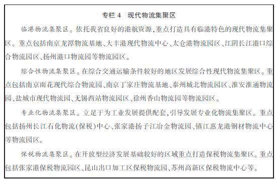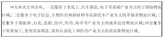現代物流集聚區。構建以沿江、沿海以及空港為重點的臨港物流集聚區,該區域重點發揮全省海港、長江港口、空港的貨物集散和吞吐能力,發展“大進大出”的臨港物流業;依托公路、鐵路等交通基礎設施和區位交通條件,在南京、無錫、常州、揚州、淮安等地建設綜合性物流集聚區;依托工業布局特征,配套發展以為汽車、石化、醫藥、紡織、冶金等行業服務為主的專業性物流集聚區;體現服務業對外開放特征,在開放型經濟發展基礎較好的區域重點打造保稅物流集聚區。
