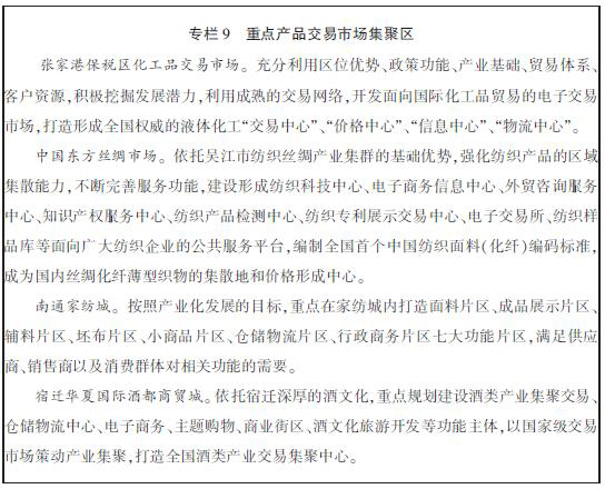 產品交易市場集聚區。以工業產品、日用消費品的交易為主,在全省范圍內重點建設集電子商務、產品展示、產品交易、批發零售、研發設計、旅游會展、價格發布、儲運物流等為一體的集中區域。在制造業較為發達、工業原材料和產品用量較大、擁有便捷交通方式的區域,江陰、張家港、常熟一帶建設工業用品專業交易市場。在擁有公路、鐵路、水路多式聯運,城郊結合部的交通樞紐區域建設農產品以及其他日用品為主的綜合性交易市場。側重有形市場和無形市場結合,強化信息化建設。