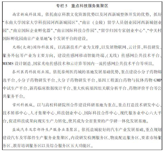 科技服務集聚區。充分發揮我省科技、人才和創新等方面的優勢,大力發展產業特色鮮明的科技服務集聚區,提高科技成果轉化能力,把各類園區建設成為高新技術研發聚集地、孵化基地和產業化基地。蘇南地區策應產業高新化發展特征,重點發展科技創新服務集聚區,以公共研發平臺建設為主,強化新興產業中關鍵技術和成果的研發與產業化。蘇中、蘇北地區則以科技創業集聚區建設為主,側重于為各類中小企業提供各類專業技術服務的集技術檢測、技術推廣服務、成果轉化產學研合作以及標準廠房、留學創業等基礎科技服務為主。