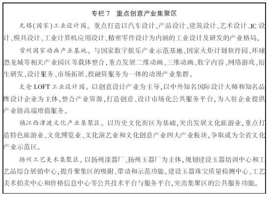創意產業集聚區。根據全省不同地區產業發展特征,結合文化、傳統等多種要素資源,在城區或開發區,充分利用城市“退二進三”的保護性開發建筑或存量土地,大力發展以研發設計創意、建筑設計創意、文化傳媒創意、咨詢策劃創意和時尚消費創意為主體的創意產業集聚區。重點在常州、無錫、揚州等地發展動漫設計、工業設計、文化創意等產業集聚區,在蘇州高新技術產業較為發達的地區發展咨詢策劃創意和時尚消費創意等類型的集聚區。