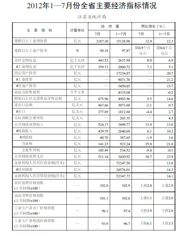 2012年1-7月份全省主要經濟指標情況