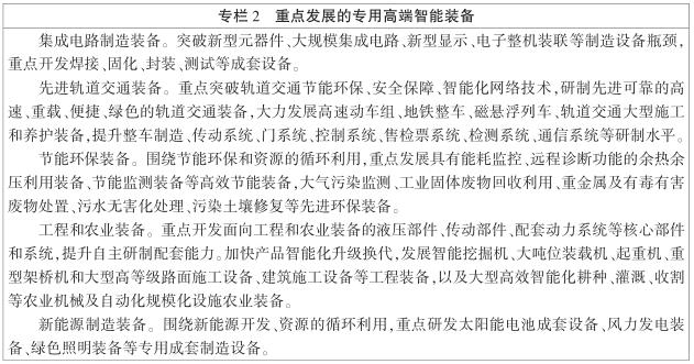 推進行業裝備升級,研發專用高端智能裝備。圍繞重點行業的智能化生產需求,研制高效、綠色、智能的大型成套裝備,加快新材料、新技術和新工藝的應用,促進成套裝備向自動化、智能化、標準化、集成化、節能化方向發展。
