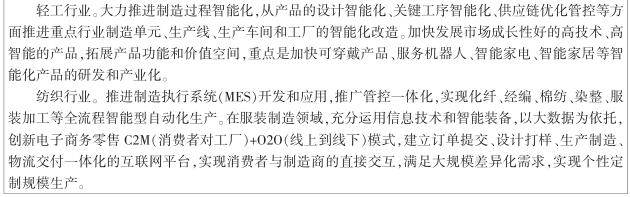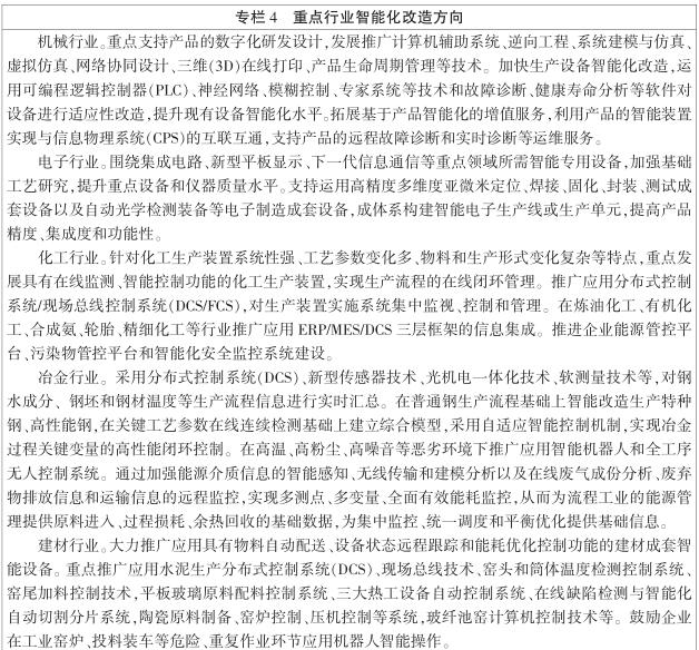 (六)著力支持重點行業智能轉型。圍繞制造業重點行業和領域推進智能產品設計、智能裝備應用、智能產品生產、智能服務,培育和推廣離散型、流程型、網絡協同制造、大規模個性化定制、遠程運維服務等智能制造新模式。