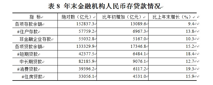金融信貸規模擴大。年末全省金融機構人民幣存款余額152837.3億元,比年初增長9.4%,增加13089.6億元。其中,住戶存款比年初增加6967.3億元,非金融企業存款比年初增加5167.0億元。年末金融機構人民幣貸款余額133329.9億元,比年初增長15.2%,增加17346.8億元。其中,中長期貸款比年初增加9076.1億元,短期貸款比年初增加6484.1億元。