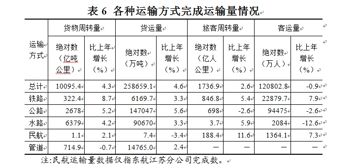 交通運輸基本平穩。全年貨物運輸量比上年增長4.6%,旅客運輸量下降0.9%;貨物周轉量比上年增長4.3%,旅客周轉量比上年增長2.6%。全省機場飛機起降56.1萬架次,比上年增長8.7%;旅客吞吐量5844.0萬人次,增長13.2%;貨郵吞吐量64.2萬噸,增長7.5%。規模以上港口貨物吞吐量26.3億噸,比上年增長12.8%。其中外貿貨物吞吐量5.2億噸,增長7.0%;集裝箱吞吐量1872.6萬標準集裝箱,增長4.1%。年末全省高速公路里程4865.0公里。鐵路營業里程3539.0公里,鐵路正線延展長度6252.9公里。年末民用汽車保有量1919.2萬輛,增長7.6%;凈增136.0萬輛。年末私人汽車保有量1646.2萬輛,增長7.1%;凈增108.5萬輛。其中,私人轎車保有量1131.3萬輛,增長6.0%;凈增64.5萬輛。