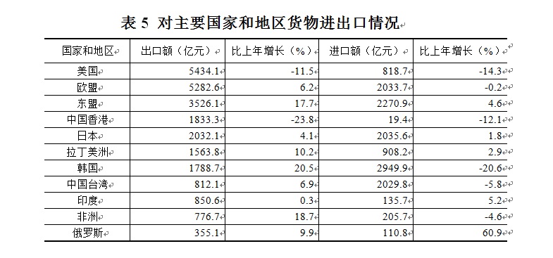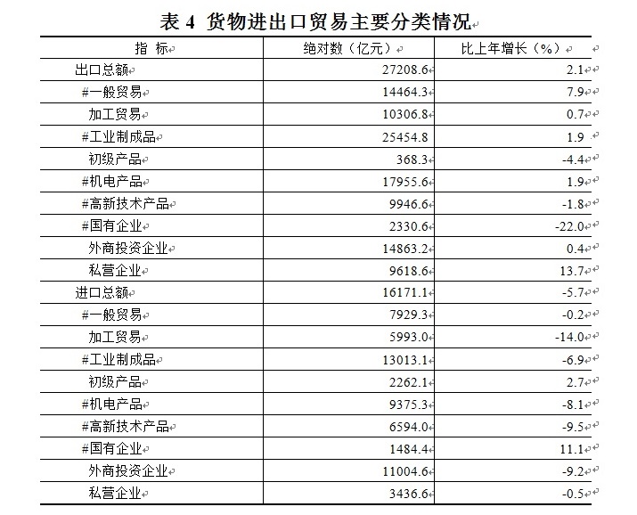 進出口保持基本穩定。全省完成進出口總額43379.7億元,比上年下降1.0%。其中,出口27208.6億元,增長2.1%;進口16171.1億元,下降5.7%。從貿易方式看,一般貿易進出口總額22393.6億元,增長4.9%;占進出口總額比重達51.6%,超過加工貿易14.0個百分點。從出口主體看,國有企業、外資企業、私營企業出口額分別下降22.0%、增長0.4%、增長13.7%。從出口市場看,對美國、歐盟、日本出口比上年分別下降11.5%、增長6.2%、增長4.1%,對印度、俄羅斯、東盟出口分別增長0.3%、9.9%和17.7%。從出口產品看,機電、高新技術產品出口額分別增長1.9%、下降1.8%。對“一帶一路”沿線國家出口保持較快增長,出口額7284.2億元,增長12.8%;占全省出口總額的比重為26.8%,對全省出口增長的貢獻率為147.3%。