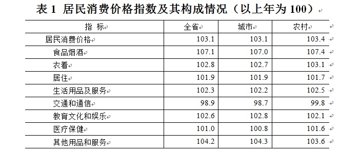 物價水平總體穩定。全年居民消費價格比上年上漲3.1%,其中城市上漲3.1%,農村上漲3.4%。分類別看,食品煙酒類上漲7.1%,衣著類上漲2.8%,居住類上漲1.9%,生活用品及服務類上漲2.3%,教育文化和娛樂類上漲2.6%,醫療保健類上漲1.0%,其他用品和服務類上漲4.2%;交通和通信類下跌1.1%。食品中,糧食上漲1.1%,食用油上漲1.8%,鮮菜上漲3.8%,畜肉類上漲28.0%,蛋類上漲5.9%,鮮瓜果上漲12.6%;水產品下跌0.9%。工業生產者價格有所走低。全年工業生產者出廠價格下降1.1%,工業生產者購進價格下降2.8%。