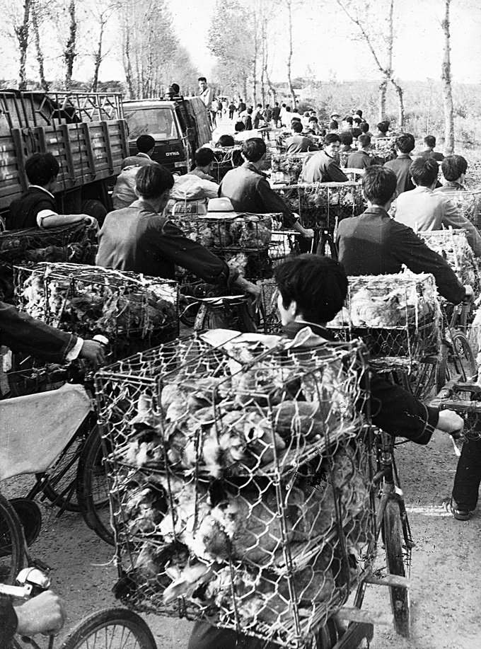 在普遍推行家庭聯產承包責任制基礎上,江蘇農村涌現出一大批種養、運輸和經銷等各種專業戶、重點戶。20世紀80年代初,海安農民自發組織起成千上萬人的隊伍,騎車馱雞,渡船過江,搶占了上海、蘇州等多個大中城市的活雞交易市場。圖為1985年12月拍攝的海安養雞專業戶銷售大軍。楊一秋 攝