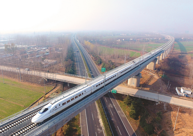 江蘇大力建設現代綜合交通運輸體系。2019年12月16日,徐宿淮鹽高鐵、連淮高鐵開通運營,蘇北5市全面邁進“高鐵時代”。圖為徐宿淮鹽高速鐵路行駛在宿遷大地上。鄭緒軍 攝