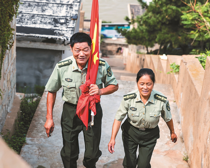 “時代楷模”、灌云縣開山島民兵哨所原民兵王繼才、王仕花,從1986年起,奉命守衛黃海前哨開山島,在沒水沒電的孤島上一守就是32年,把青春年華獻給了祖國海防事業,書寫了愛國奉獻的新時代奮斗篇章。圖為2017年8月9日,王繼才、王仕花迎著朝陽沿著山路去山頂廣場升國旗。王冠軍 攝