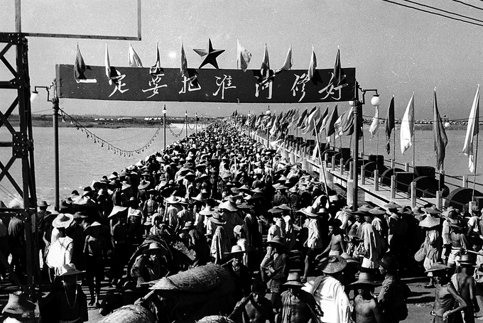 新中國成立以后,江蘇開展大規模水利建設,先后完成了導沂整沭、蘇北灌溉總渠、治理淮河等重大工程,農業生產條件大為改善。1953年7月,淮河流域最大的水閘——位于江蘇洪澤湖下游的三河閘建成放水。圖為慶祝典禮現場。曉莊 攝