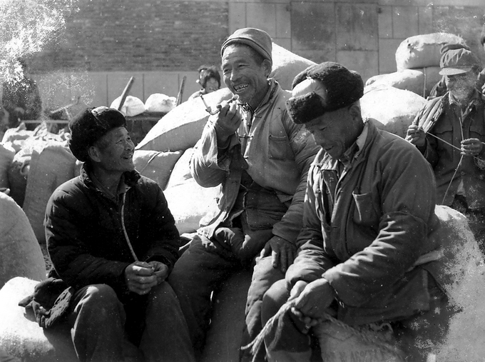 1978年秋,泗洪縣上塘公社墊湖大隊?(今宿遷市泗洪縣上塘鎮墊湖村)實行包產到戶,拉開了江蘇農村改革的大幕。圖為墊湖大隊包產到戶后的農民喜售豐收糧。馮書倫 攝
