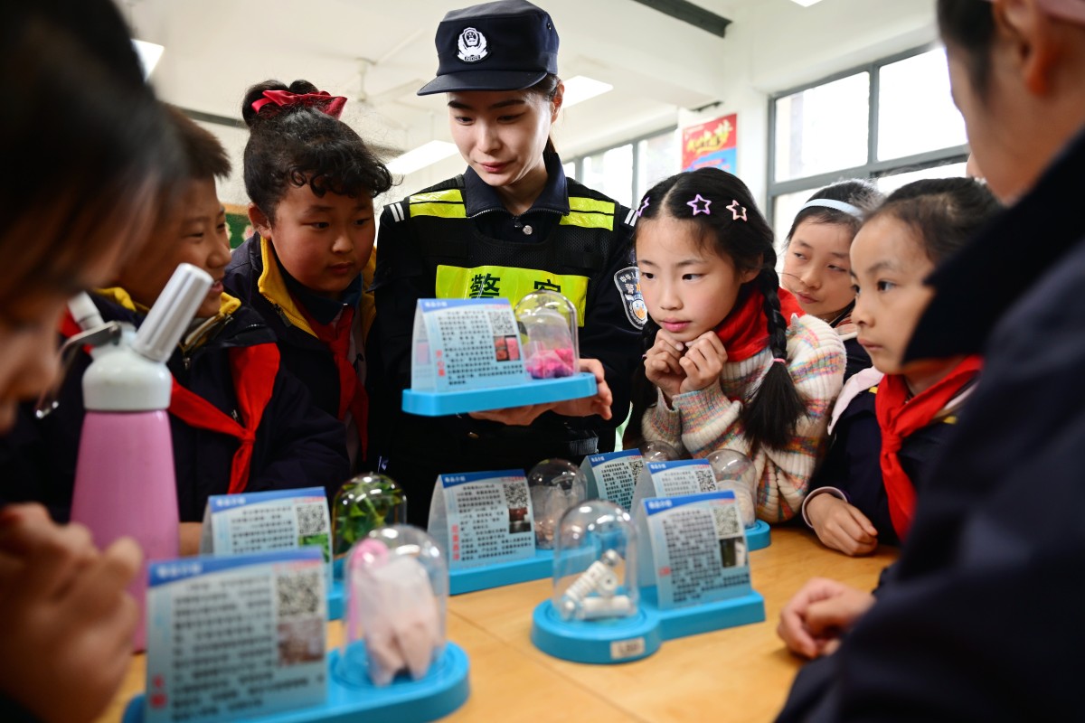 民警通過仿真毒品模型給學生宣傳禁毒知識