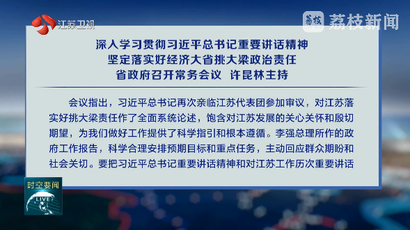 3月13日,省政府召開常務會議,認真學習習近平總書記參加十四屆全國人大三次會議江蘇代表團審議時的重要講話精神和全國兩會精神,落實國務院政府工作報告部署,研究安排重點工作。查看全文 >