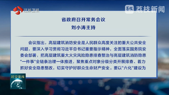 • 深入學(xué)習(xí)貫徹黨的二十屆四中全會精神,認(rèn)真落實省委十四屆十次全會部署,研究部署高層建筑重大火災(zāi)風(fēng)險隱患排查整治相關(guān)工作,聽取2025年江蘇省省長質(zhì)量獎評審和第四屆江蘇省紫峰獎評選情況匯報,安排下一階段重點工作。